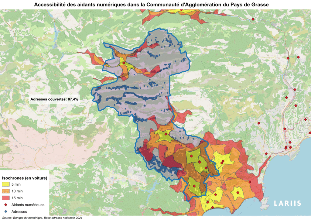 Une carte isochrone est une représentation graphique qui montre les zones qui peuvent être atteintes depuis un point donné dans un temps défini. Elle est utilisée pour visualiser les temps de déplacement à partir d’un emplacement central vers différentes destinations. Les zones sont généralement colorées ou hachurées en fonction du temps de déplacement, ce qui permet de distinguer les zones accessibles dans des intervalles de temps spécifiques, tels que 30 minutes, 1 heure, etc. Les cartes isochrones sont utiles pour la planification des transports, l’aménagement urbain, la couverture et l’accessibilité de l’offre de service ainsi que les autres domaines où la notion de temps de déplacement est cruciale. Elles aident à identifier les zones accessibles et à prendre des décisions basées sur la proximité temporelle plutôt que sur la distance physique.
